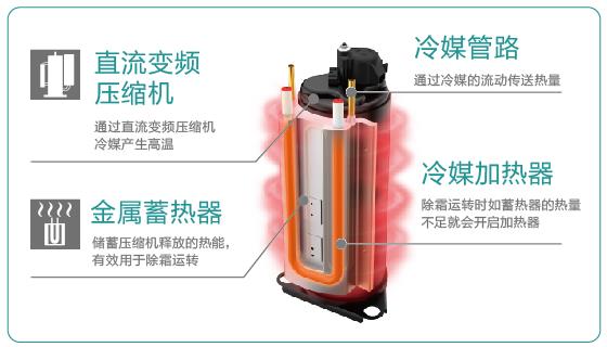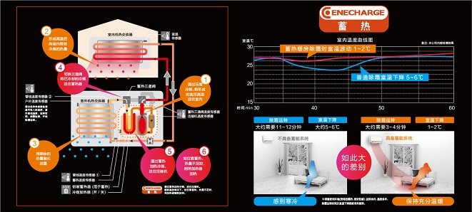 蓄热除霜:压缩机出来的热的冷媒,一部分热量吹到房间内,一部分回流到室外机进行除霜,这时候室内温度会稍微下降一点。冷媒从室外机出来后,一部分进入压缩机,一部分去到蓄热槽,所以这次的冷媒温度比上次高,依次类推。蓄热空调能够通过蓄热装置吸收压缩机的废热,加热冷媒送往压缩机。超低温情况下,如仅靠蓄热,热量不足时用加热器辅助加热(1200W)。如此一来,空调不会因为结霜而导致室内机停止供暖,室内温度波动自然小,恒温舒适。