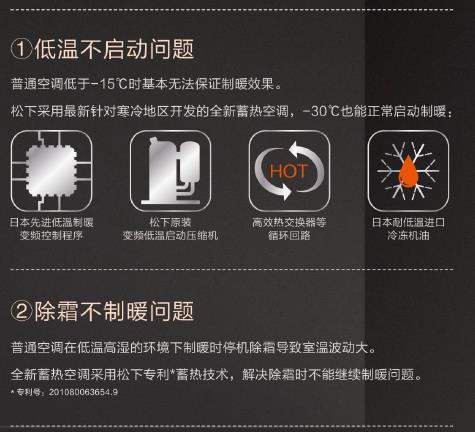 对于一般空调而言,低温难启动、除霜停机导致温度波动大等问题,一直制约消费者将空调作为冬季供暖的常用工具。以往,我们一般采取的解决方法:1、换大匹数空调;2、买带电辅热空调;但依然要停机除霜,只不过除完霜之后,温度会上升的快一点。总的来说,普通空调不能彻底解决停机除霜问题。同时,电辅助加热空调带来能耗的提升,而且在长期使用的过程中也存在安全隐患。为了打造寒冷地区专用空调,松下空调自1981年以来,便开始潜心研发蓄热技术,致力于打破制暖除霜技术壁垒。