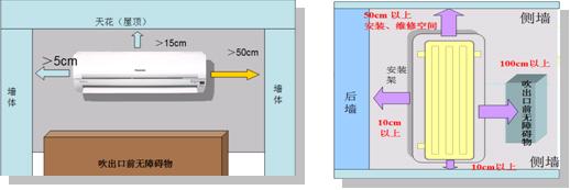 6、 空调内外机的四周应该留有一定的空间,尤其是吹出口方向,不能有任何障碍物阻挡,(如室外机前安装百叶等)以免造成风道短路(吹出的风直接回到吸入口处)。