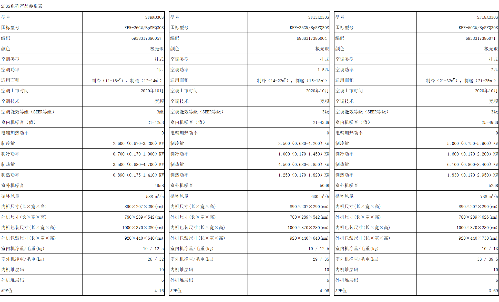 > 20年SF3S系列参数一览