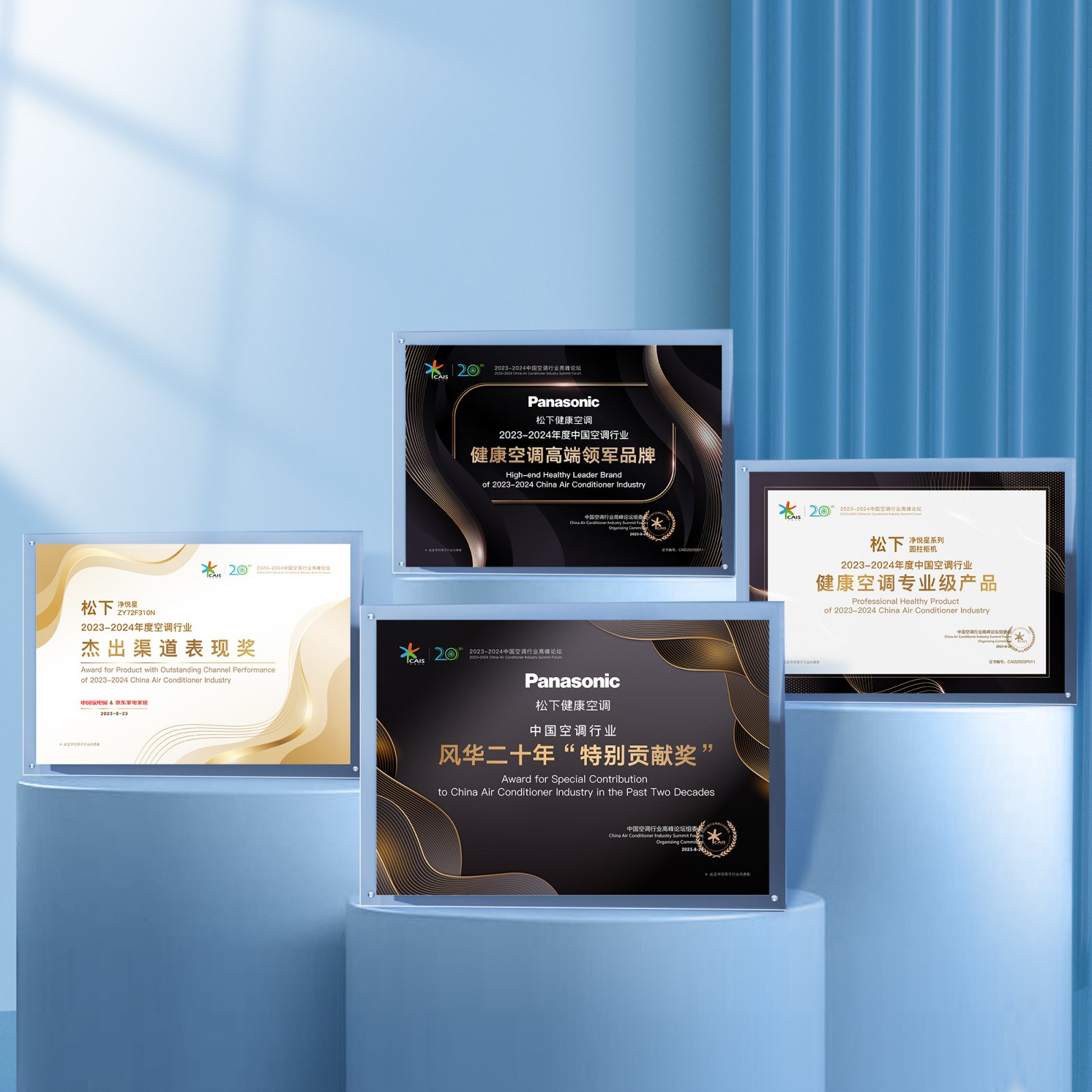 松下空调受邀出席本次大会,凭借技术实力与产品表现,荣获“健康空调高端领军品牌”“风华二十年‘特别贡献奖‘”“健康空调专业级产品”“杰出渠道表现奖”四大奖项