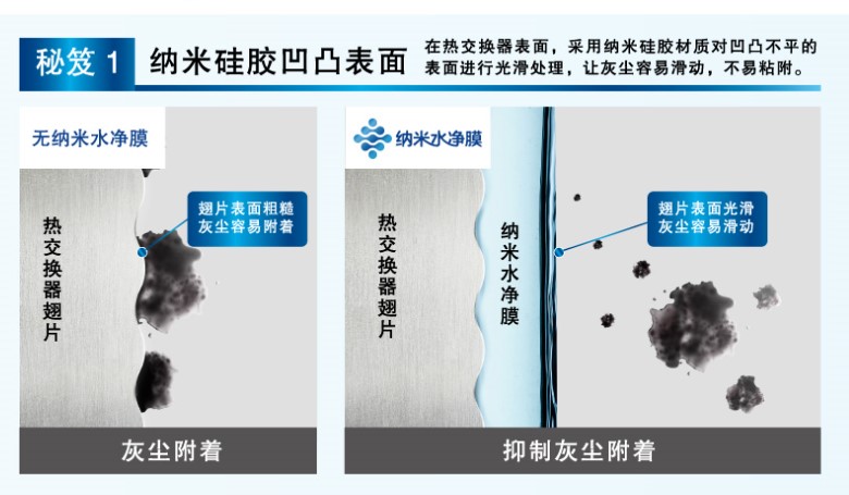 优势一就是纳米硅胶凹凸表面。以往的很多空调热交换器表面凹凸不平,很容易附着灰尘,而松下空调E3系列的热交换器表面采用纳米硅胶材质对其进行光滑处理,让灰尘容易滑动,不易附着。