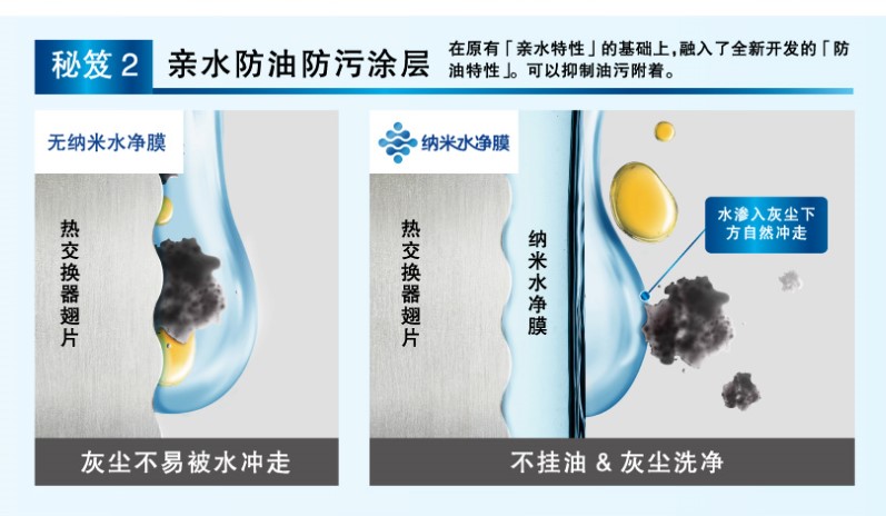 优势二是亲水防油防污涂层。以往机型的空调喷涂面只停留在翅片的表面,很难实现热交换器断面喷涂防污防油涂层,而松下空调E3系列在松下纳米水净膜原有的“亲水特性”基础上,融入全新开发的“防油特性”,不仅可以抑制油分附着,而且水渗入灰尘下方会自然将其冲走。有了纳米水净膜的守候,松下空调E3系列保证了从源头上吹送健康的清洁空气。