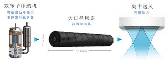 其次,AW空调还拥有采用强力稀土永磁材料制成的松下原装直流变频压缩机,具有更高的磁性与扭矩,原装压缩机采用双转子结构,运行更平稳,可在-15°C~43°C的严酷气候环境下稳定启动,具有强劲的制冷制暖能力。AW空调的送风范围达到14米的远距,其秘诀就在于这款松下双转子压缩机,配备大口径加长版风扇,搭载集中送风模式,可将强劲气流,送达14米远处。让您不论在客厅还是厨房,皆可安享冬暖夏凉的舒适。