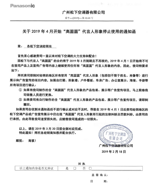 关于2019年4月开始“高圆圆”代言人形象停止使用的通知函